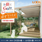 2024春お庭にGotoキャンペーンのお知らせ LIXILの「お庭にGotoキャンペーン」のご案内です。 期間中、対象商品をご契約いただいたお客様にもれなく1万円分の商品券が当たります。 さらに今回は抽選で5万円分の商品券が当たる商品もあります。 〇必ずもらえる1万円分の商品券 期間中、ガーデンルーム・デッキ・プラスG・フェンスAA、AB・SCシリーズ・積雪カーポートの対象商品をご契約・申請いただいたお客様に...