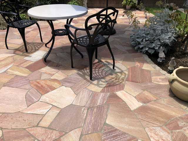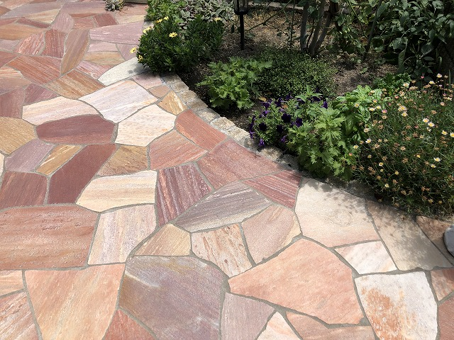 石張りと花壇、芝生の見切りにはサビ色のピンコロ石を並べてあります。