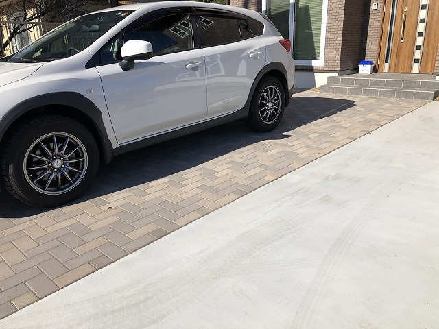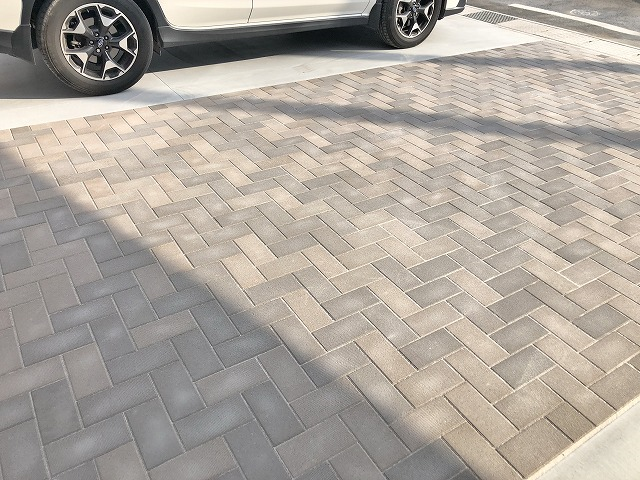 アプローチはブラウン系色のインターロッキングブロックで舗装を行っています。