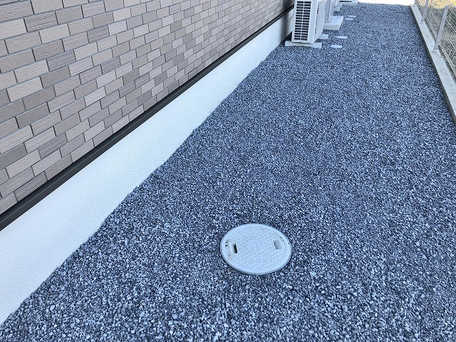 住宅外周部は防草シートを敷いた上で化粧砂利敷きにしてあります。