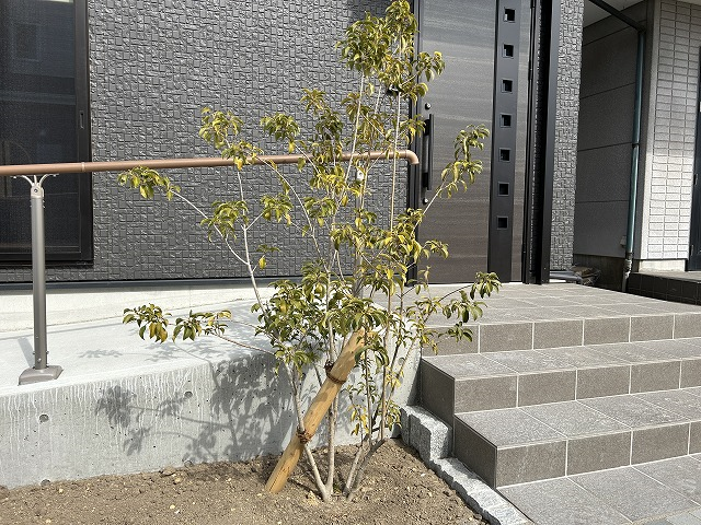 入り口脇にはソヨゴを植えてあります。