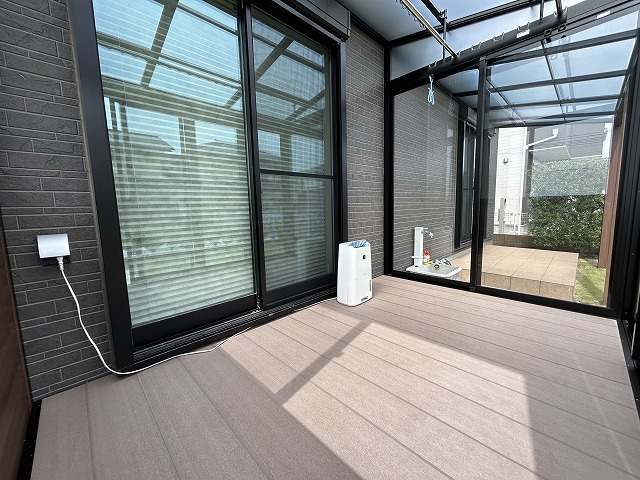ガーデンルームGFの床仕様にテラス屋根を連結しています。