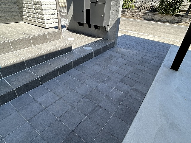 アプローチはスリットと同色でサイズ違いのインターロッキングブロックを施工してあります。