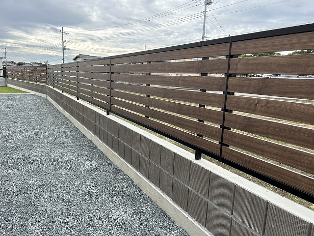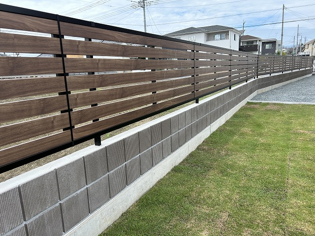 擁壁の上は化粧ブロックと木目調フェンスを組み合わせてあります。