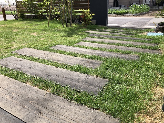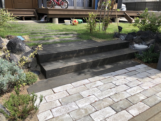 アプローチは釉薬を塗って焼いた白色のレンガと、枕木風木材を使用しています。