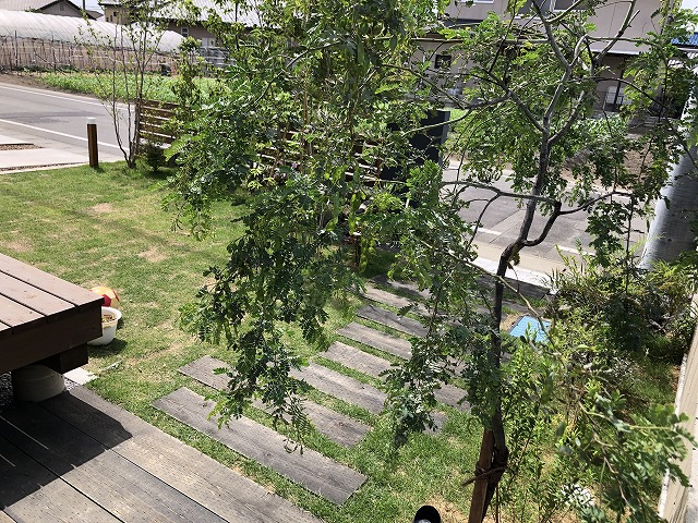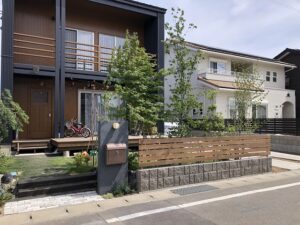 家の中と同じように庭周りも木材や植栽を多く取り入れたナチュラルテイストの外構になりました。