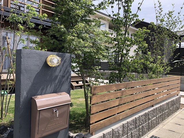 植栽の緑と、門柱、ウッドフェンスで非常に良い雰囲気になりました。