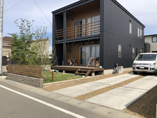 木材と金属を合わせた外観の新築住宅に合わせた外構の工事をご依頼いただきました。